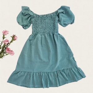 Vestido corto con estampado de cuadros, hombros descubiertos. Medidas: Talla S: pecho 63-87cm, Cintura 60-84cm, largo 81cm Talla M: pecho